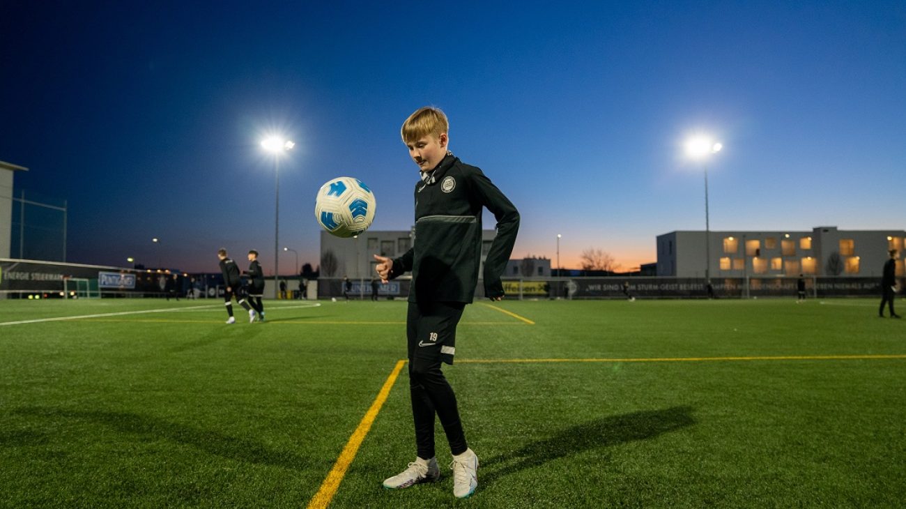 Das Können ist auch anderen nicht verborgen geblieben. Sein Trainer bei JAZ-GU Süd, seinem zweiten Verein, wechselte vor zwei Jahren als Betreuer in den Nachwuchs des SK Sturm – und nahm Tobias gleich mit. Seither sind die Wochen intensiver. Drei Mal die Woche Training, am Wochenende Spiele, dazu zwei Mal pro Woche Nachmittagsunterricht in der Schule. In der skills.lab Arena in Wundschuh arbeitet er zusätzlich weiterhin an seiner Technik und Übersicht. Bei Sturm kommt er als rechter Verteidiger zum Einsatz, noch lieber würde er aber auf dem Flügel spielen. Wie Luis Díaz. „Aber es gefällt mir gut bis jetzt. Die Teamkollegen haben mich gut aufgenommen“, klingt Tobias schon wie ein Profi.